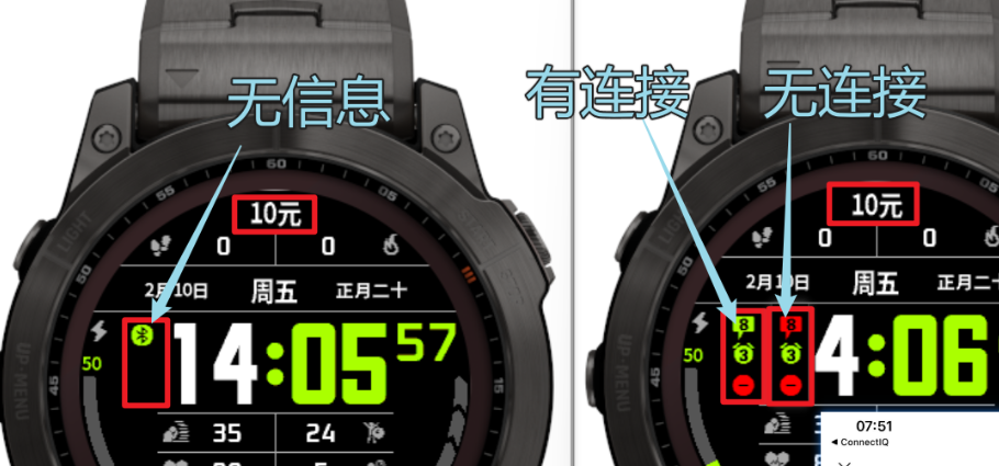 颜色指示连接状态,有消息显示消息数量,无消息显示蓝牙图标,红色消息数量表示有消息,无连接,一图解释: