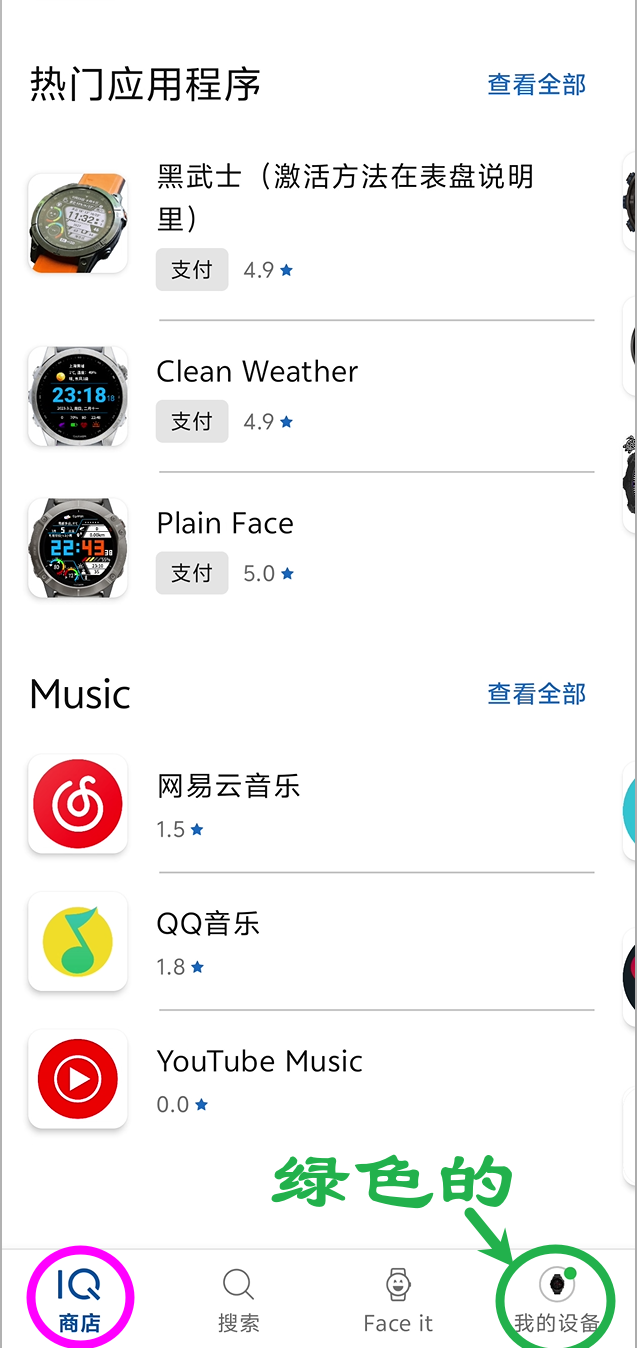 安装表盘¶ 一、下载安装APP¶ 正常是通过connect IQ进行安装: 官方下载链接 但是,connect IQ 是依赖connect的,如果没安装connect的话,可以下载安装,并连接手表 官方下载链接 二、打开APP¶ 打开之后,是表盘主页,注意,右下角我的设备上有个绿点,如果是红点,说明没检测到你的表 三、安装表盘¶ 这里以黑武士为例 安装、激活会遇到的问题 搜索¶ 点击搜索 填写关键词“黑武士” 搜索 安装¶ 点击进表盘界面 顺利的话 同时,手表上也会出现这个表盘 设置表盘¶ 设置表盘
